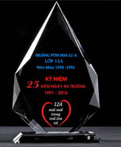 Quà tặng 25 năm ra trường được làm từ thủy tinh trong, phối thêm các màu khác theo yêu cầu, nội dung khắc hoặc in trực tiếp. Kích thước Quà tặng 25 năm ra trường làm theo yêu cầu, dùng vinh danh, trao giải, mẫu mã rất đa dạng và nội dung theo yêu cầu riêng.